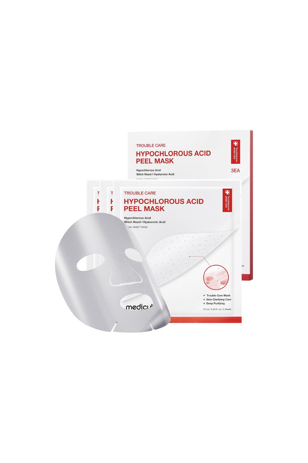 A key ingredient in the medicube Hypochlorous Acid Peel Mask is hypochlorous acid, known for its calming and purifying properties. It helps: